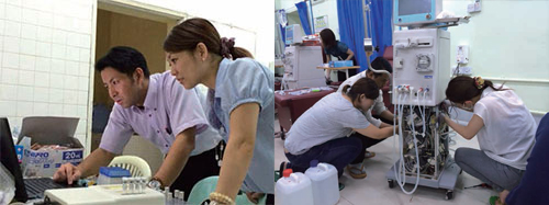 Dialysates used for dialysis therapy must be free of contamination and thoroughly purified. However, purification requires advanced technologies and sufficient equipment. We carry out activities in Myanmar to help promote dialysate purification, such as measuring the dialysates’ purity level, installing an ETRF in a dialysis machine, and giving technical guidance on equipment maintenance methods and facility design.